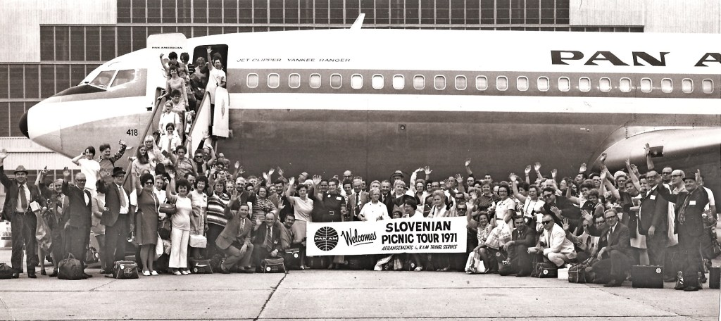 V “kovčku” sem našel fotografijo iz leta 1971, ki prikazuje prihod samo ene skupine iz ZDA. Slovenski izseljenci so najeli poseben čarter polet , da so se lahko udeležili izseljenskega piknika, ki je bil tradicionalno vedno prvo soboto v juliju v Škofji Loki.